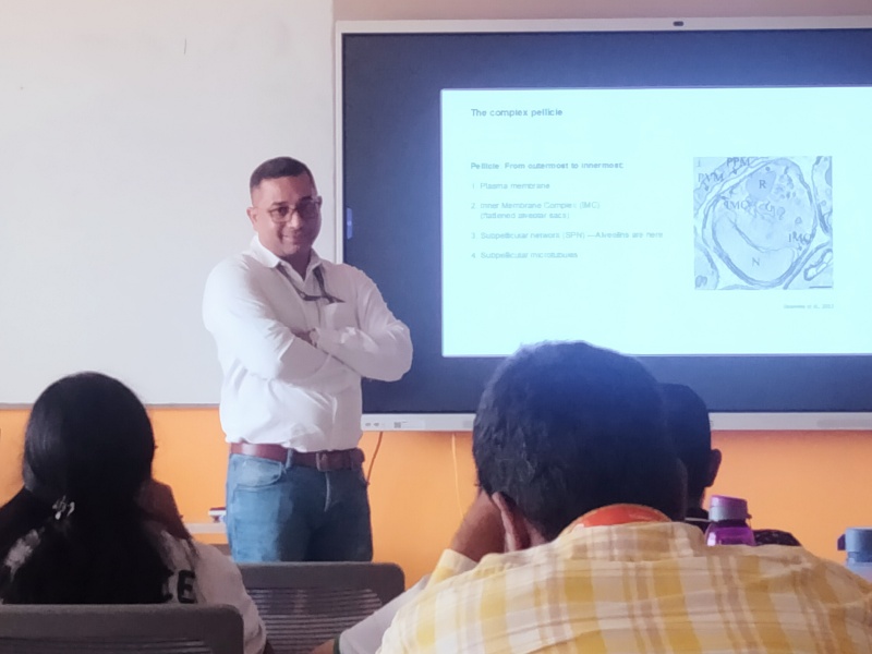 Date:10-04-2026A stimulating scientific session was delivered by Dr. Dipto Sinha on the topic “Apicomplexans: Cellular Design, Molecular Execution” at SBS. The talk offered deep insights into the fascinating biology of apicomplexan parasites, highlighting how their unique cellular architecture underpins highly specialized molecular processes essential for survival, host invasion, and disease progression.