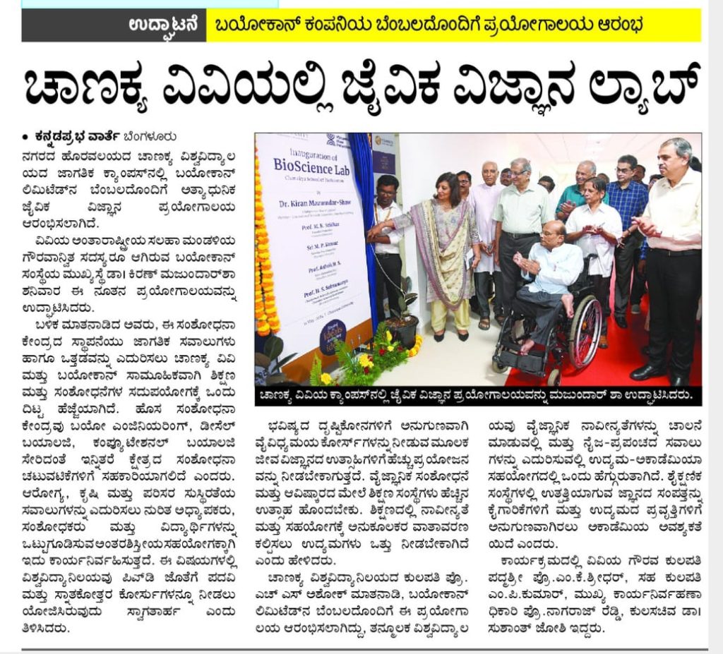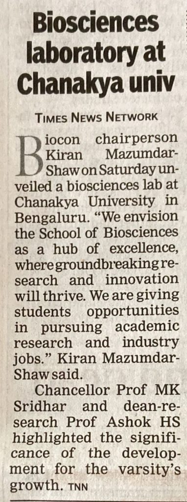 The Chanakya School of BioSciences inauguration today – Hosa Digantha – 11.05.2024School of BioSciences inaugurated at Chanakya University – Hosa Digantha – 12.05.2024Chanakya University inaugurates School of BioSciences – Vijayavani – 12.05.2024Chanakya University introduces School of BioSciences – 11.05.2024Chanakya University inaugurates School of BioSciences – Andhra Jyoti – 13.05.2024Chanakya University inaugurates School of BioSciences – Ee Nadu – 12.05.2024Kiran Mazumdar-Shaw inaugurates new Bio Science lab at Chanakya University – The New Indian Express – 12.05.2024Bio Sciences Lab at Chanakya University – Kannada Prabha – 13.05.2024BioSciences introduced at Chanakya University – Times of India – 12.05.2024