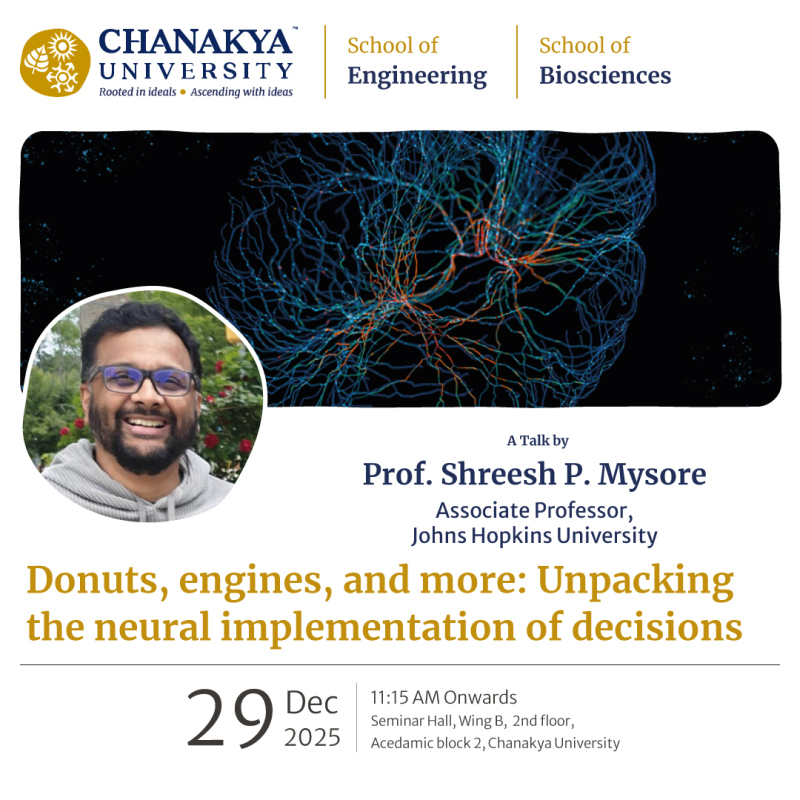 Chanakya University hosted Prof. Shreesh Mysore from Johns Hopkins University for an academic talk that drew active participation from students and faculty members across multiple disciplines. The session was noted for its engaging and interdisciplinary nature, offering valuable perspectives that resonated with diverse academic audiences.