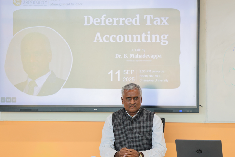 On 11 September 2025, the Chanakya Chamber of Commerce (School of Management Sciences) organized a lecture on Deferred Tax Accounting for students of commerce and management. The session, conducted by Dr. B. Mahadevappa, provided an overview of the concept of deferred tax, focusing on the differences between taxable income and pre-tax accounting income, and how these differences create deferred tax assets and liabilities.