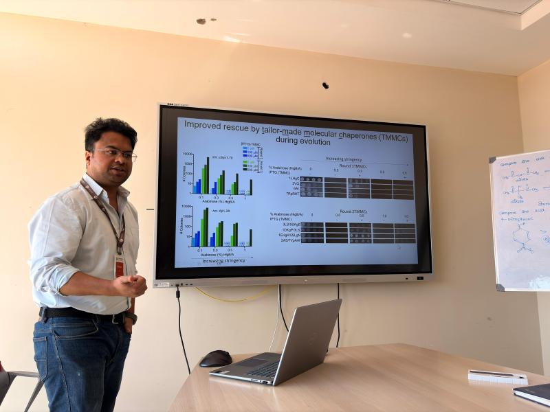 Dr Arpit Gupta (California Institute of Technology) delivered an insightful presentation on the directed evolution of tailor-made molecular chaperones, highlighting how engineered chaperone proteins can be systematically evolved in the lab to enhance their ability to assist protein folding. Combating misfolding problems is a cutting-edge approach that bridges protein engineering with therapeutic potential in diseases involving protein aggregation.