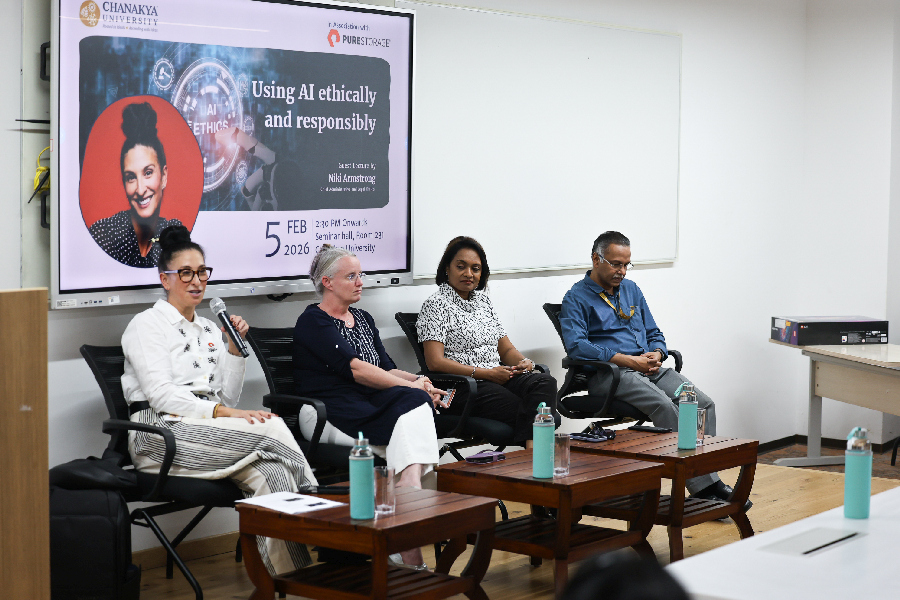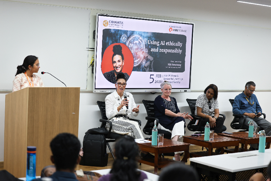 The University, in association with Pure Storage, hosted a guest lecture by Niki Armstrong, Chief Administrative and Legal Officer, on 5th February 2026 at the Seminar Hall. Armstrong brought a sharp legal and institutional lens to the rapidly evolving discourse on artificial intelligence, addressing the ethical responsibilities that organisations and individuals must embrace as AI becomes deeply embedded in professional and public life. She examined frameworks for responsible AI use, the risks of unchecked deployment, and the growing importance of governance structures. The session offered students a grounded, practitioner-driven perspective on one of the defining challenges of our time.