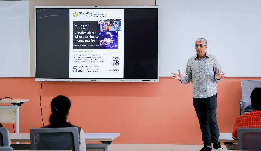 Chanakya University’s School of Mathematics and Natural Sciences successfully hosted a one-day workshop titled “Everyday Science: Where Curiosity Meets Reality” on 5 December 2025. Students from Vishwa Vidyapeeth, Sri Surya PU College, and Rashtrothanna Vidya Kendra enthusiastically participated in the programme.